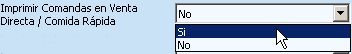 Si- Al seleccionar esta opción, se imprimirán comandas en las impresoras de Cocina, Bar y Barra al realizar una venta en las Terminales Comida Rápida o al realizar una Venta Directa en las Terminales Punto de Venta.