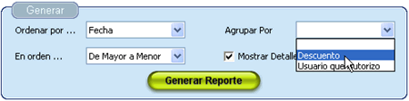 En este reporte se muestran los descuentos aplicados por los usuarios que los autorizaron. El reporte puede ser generado si se agrupa la información por el campo Usuario que Autorizo.